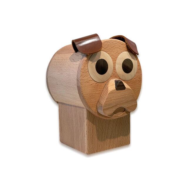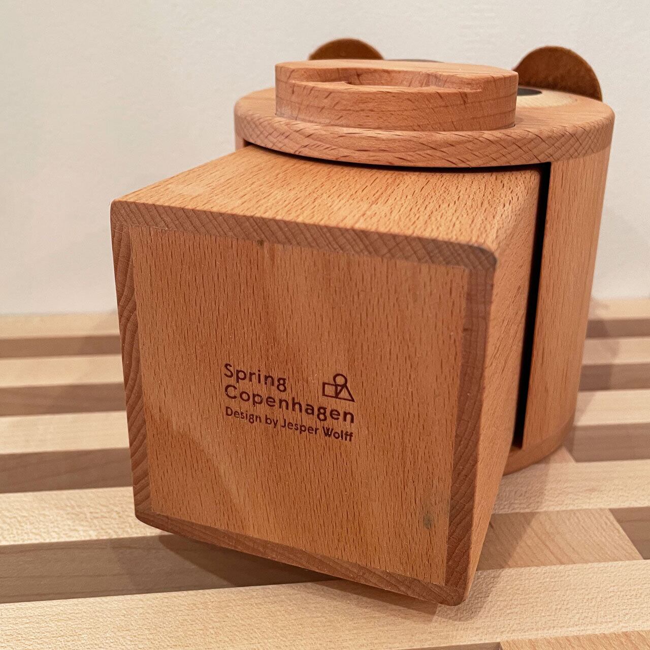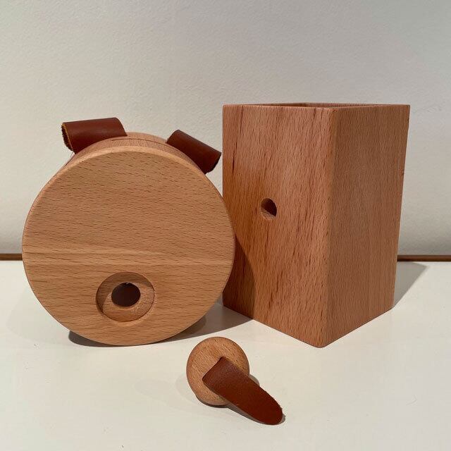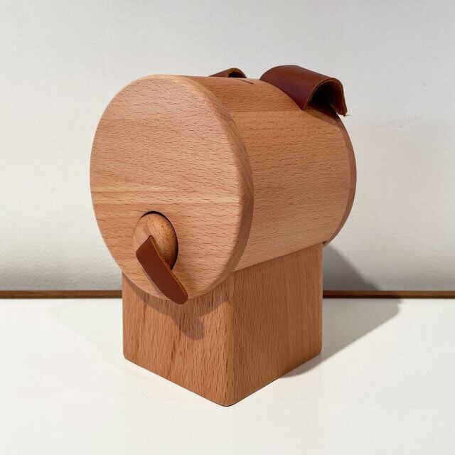 ・デンマークの「ビーチ, メープル, ウォールナット, 革」を使ったカワイイ貯金箱です。